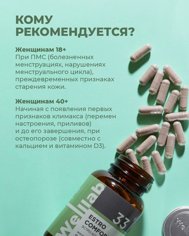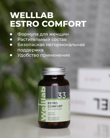 WELLLAB ESTRO COMFORT содержит комплекс фитоэстрогенов, которые помогают стабилизировать эмоциональный фон и оказывают общеукрепляющее действие на организм женщины в периоды пре- и постменопаузы, а также при предменструальном синдроме. ⠀ ⠀ ⠀