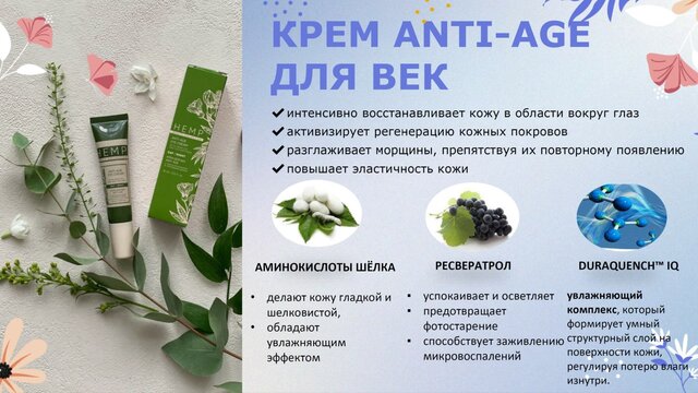 🌿КРЕМ ANTI-AGE ДЛЯ ВЕК С МАСЛОМ КОНОПЛИ И ПЕПТИДАМИ ШЕЛКА🌿🌿Красота вне возраста! Нежный крем для век с маслом конопли и пептидами шелка. Интенсивно восстанавливает кожу в области вокруг глаз. Антивозрастная формула крема разглаживает морщины, препятствуя их повторному появлению и повышает эластичность. Больше никаких припухлостей, отечности и морщин! Кожа вокруг глаз выглядит заметно подтянутой и упругой.