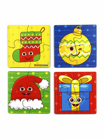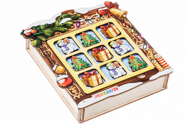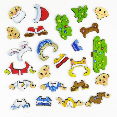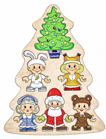 Материал: Фанера; Размер ш / в / г: 34*26см Как играть? 1. Вместе с ребенком рассмотрите содержимое коробки, предложите ребенку собрать фигурку елки. Покажите, как собрать новых персонажей, меняя местами детали одежды. 2. Опишите словами внешность героя хоровода (цвет волос, элементы одежды). Попросите ребенка собрать персонажа по вашему словесному описанию. 3. Обведите собранную фигурку по контуру на листе бумаги, раскрасьте. 4. Используйте фигурки для сюжетных игр, сочиняйте с ребенком сказки и истории про новогодний бал