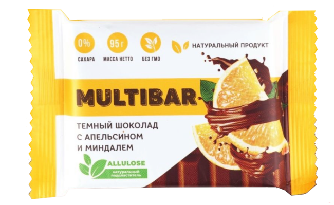 Темный шоколад с апельсином и миндалем Multibar без сахара 95г