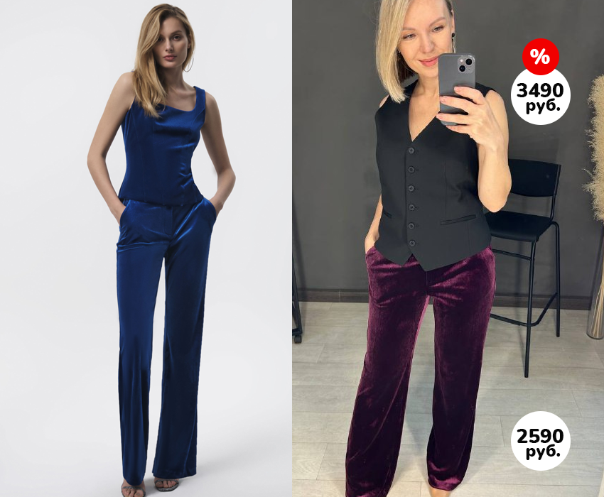 Этот жилет мы уже не раз видели. Идет в размер. И великолепный брюки, который тоже идут в размер, но сели свободно. Доступно два цвета. Очень приятная, дорогая ткань!