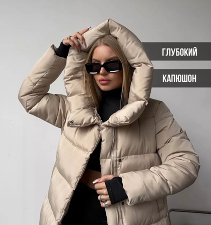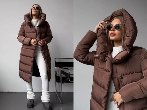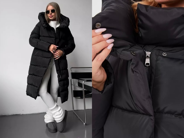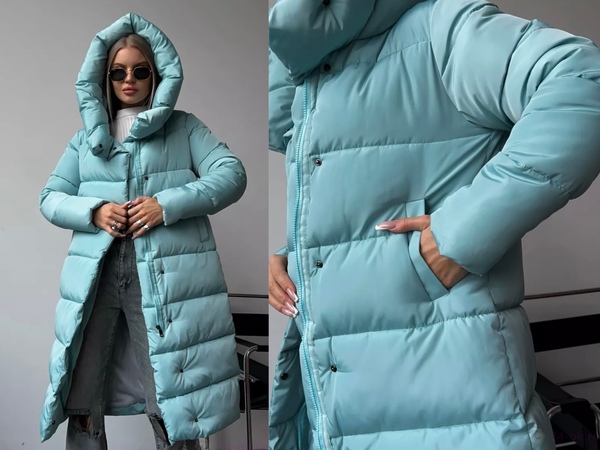 Пуховик зимний длинный с капюшоном.