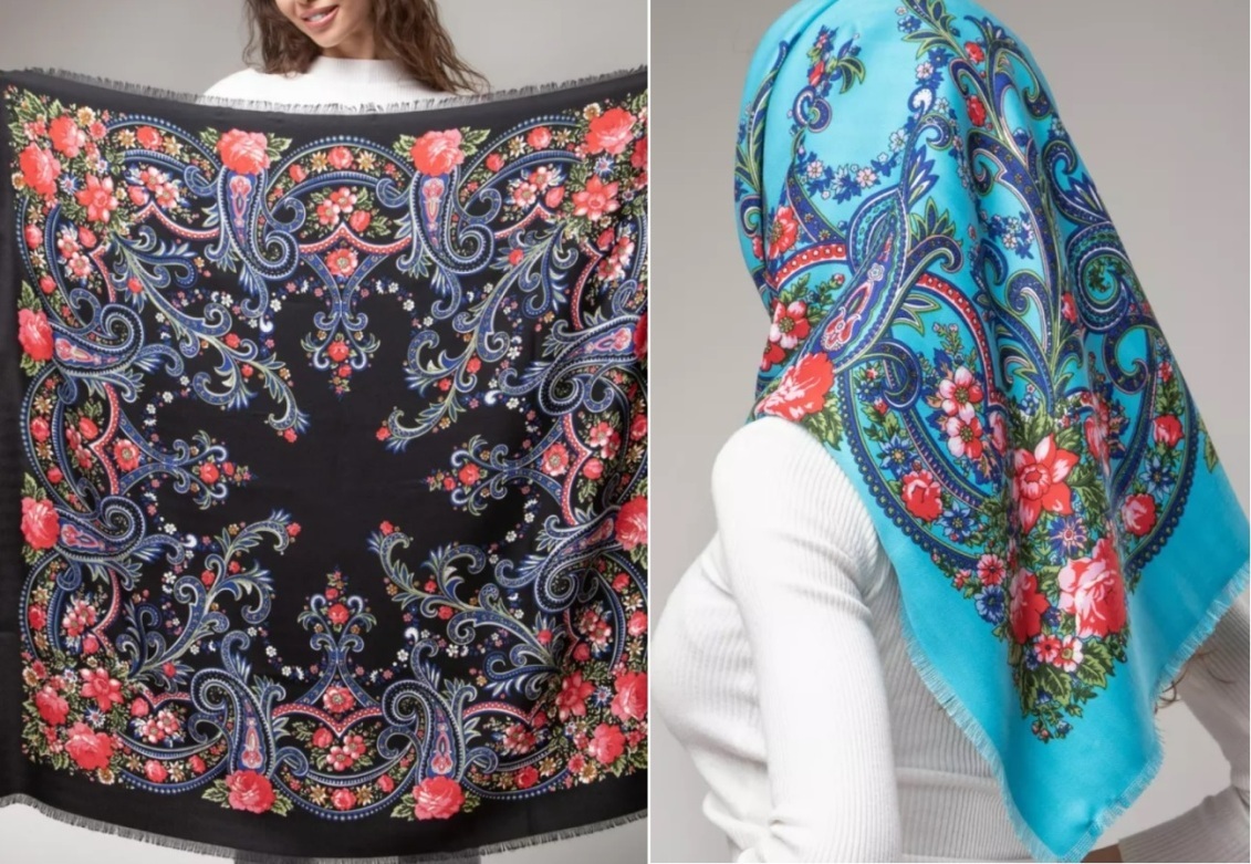 Размер универсальный 100 см на 100 см подойдет для ношения на голове, на плечах или на шее. На платке сочные краски, живописные цветы!
