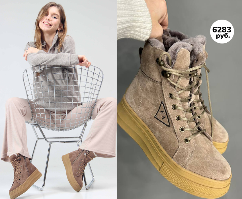 Высокие берцы в немного зернистой натуральной кожи. Тоже очень толстый слой меха. Они потяжелее, чем замшевые. Подобные подошвы по опыту не скользят!
