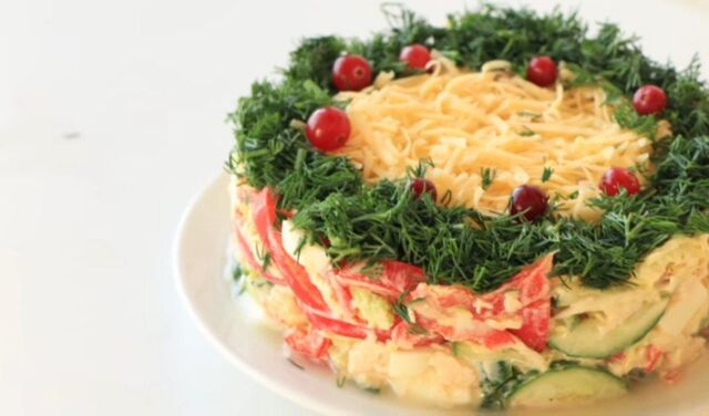 В миске смешать нарезанные ингредиенты, добавить мелко нарезанный салат, соус, перемешать. Оформить в кондитерское кольцо, дать постоять в холодильнике, снять кольцо и украсить сыром и укропом.