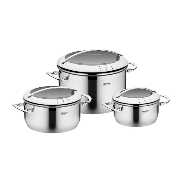 Крышка дополнена клапаном для выпуска пара и дуршлагом. Корпус и складные ручки выполнены из нержавеющей стали. Материал безопасный и прочный, не выделяет вредных веществ, устойчив к высоким температурам. Для очищения рекомендуется использовать неабразивные средства бытовой химии. Цвет - серебристый.