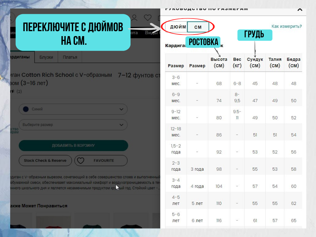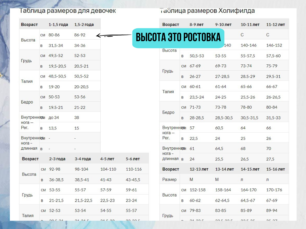 Размеры детской одежды измеряются в годах. В размерном гиде так же можно найти все замеры в см.