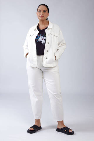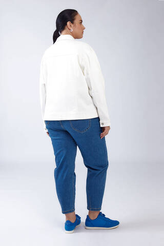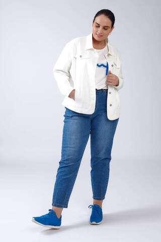 Комплект из актуальных джинс и джинсовой куртки легко представить на прогулке в городе или в весеннем офисе.