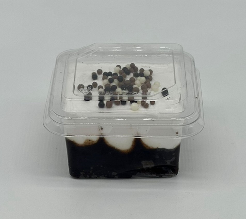 Темный бисквит, пропитанный конфитюром из черемухи и сметанным кремом, посыпка из воздушного риса в шоколадной глазури
