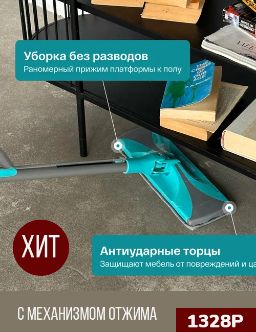 Система «отжима» одним движением отжимает насадку, и ваши руки всегда остаются сухими и чистыми!