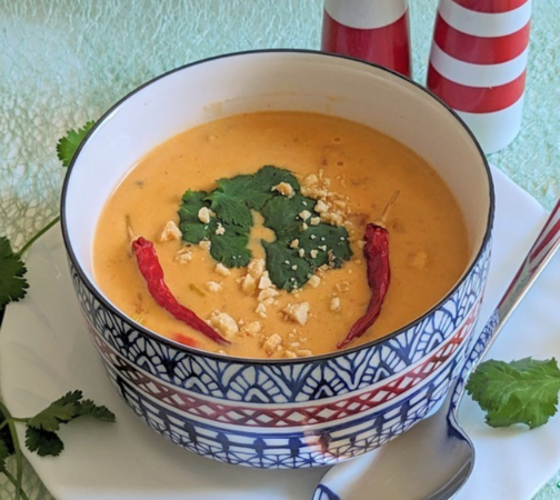Добавить все приправы, перечную и ореховую пасту, лаймовый сок и цедру. При постоянном помешивании потушить минут пять. Когда мясо побелеет, влить бульон и кокосовое молоко, довести до кипения и варить на слабом огне 15 минут. Подавать, украсив кинзой, перцем чили и толчёными орехами.