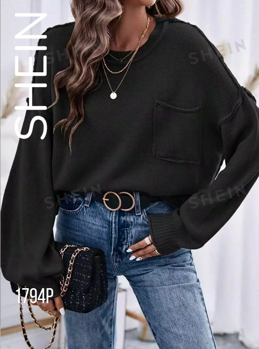 Свитер однотонный со спущенным плечом с карманом