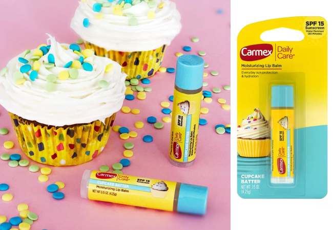 Лимитированный бальзам для губ Carmex капкейк с кондитерским ароматом свежеиспеченного кекса эффективно восстанавливает и защищает нежную кожу губ от воздействия солнца, ветра или мороза