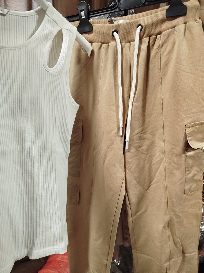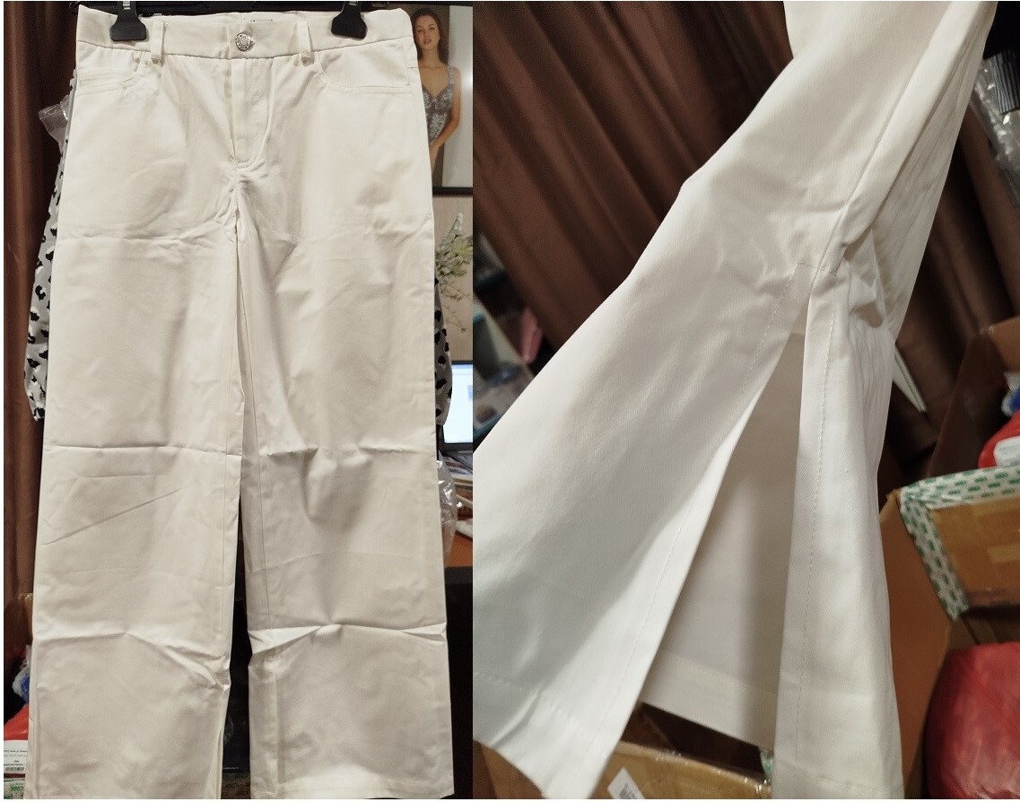 Брюки из плотного хлопка с карманами, внутри есть утяжка, внизу брючин разрезы.