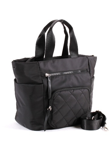 Текстильная женская сумка с одним отделением на молнии. На передней стенке - два кармана на молнии, по бокам - открытые карманы. Внутри - два отктырых кармана и карман на молнии. Две ручки высотой 14 см. Максимальная длиня съемного регулируемого ремня - 125 см. Размеры 400х260х165