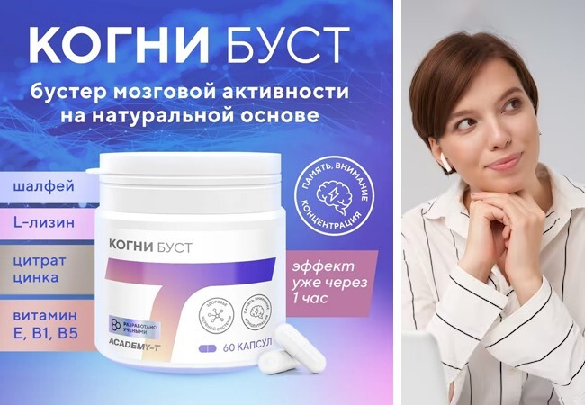 Первый эффект КогниБуста заметен уже через час после принятия первой дозы, максимальная эффективность достигается накопительным эффектом через 28 дней приема. Принимаем по 1 капсуле 2 раза в день во время еды.