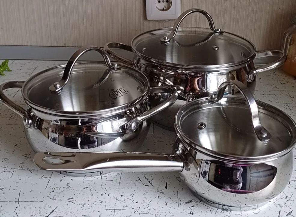 Набор посуды TERZA из 6 предметов (ковш c крышкой 1л, кастрюля с крышкой 1,8л, кастрюля с крышкой 3,4л), с индукционным капсульным дном.