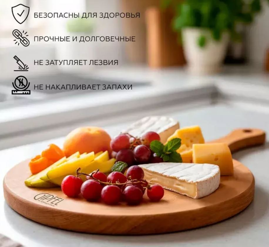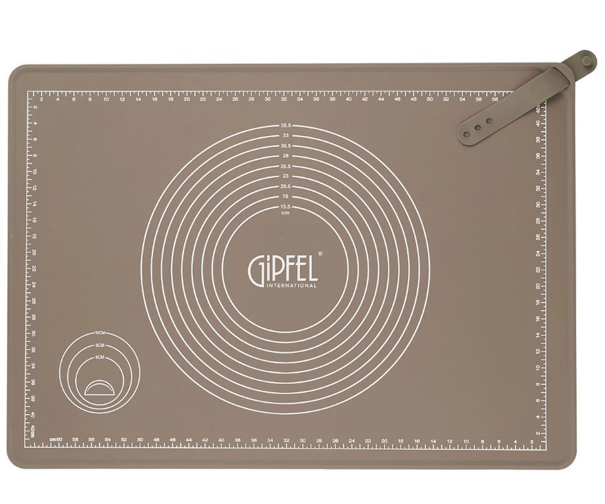 По четырем сторонам коврика нанесена удобная линейка в сантиметрах и разметка для выпечки круглых десертов разного диаметра.*Доску также можно использовать, как сервировочную: подавать на ней нарезанный сыр, канапе или другие закуски.