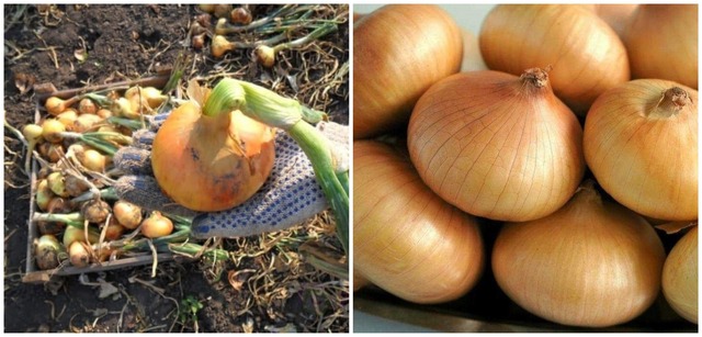 Образует крупные, плоско-округлые луковицы массой 150-180 г, желто-коричневой окраски, острого вкуса.