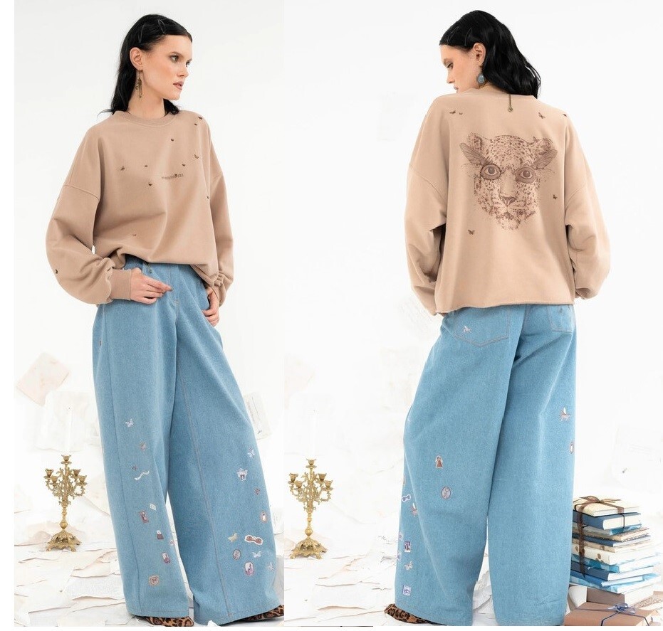 Свитшот свободного силуэта из плотного, мягкого и комфортного трикотажного полотна бежевого оттенка.