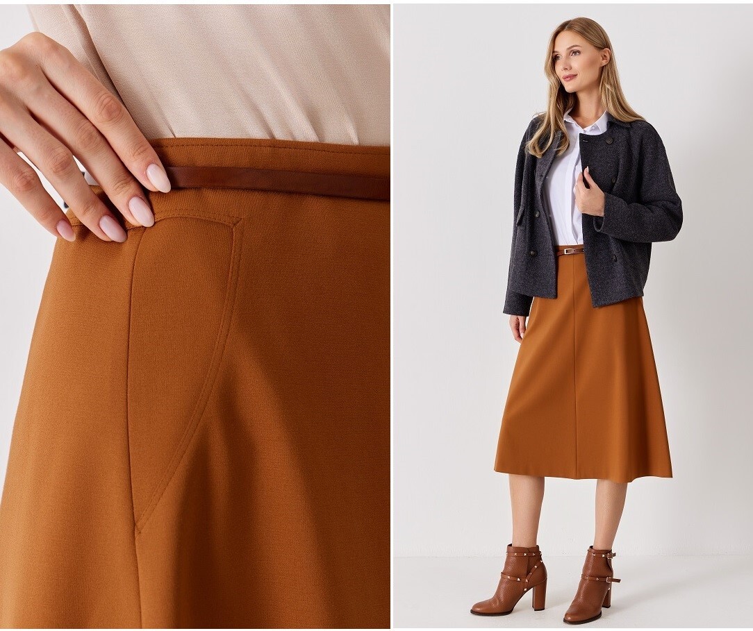 Фасон на четырех клиньях мягко облегает фигуру, обеспечивая безупречную посадку и свободу движений.