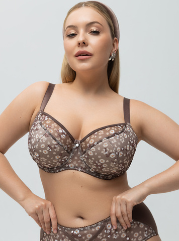 Бюстгальтер с полупоролоновой чашкой на каркасах выполнен из неэластичной вышивки и эластичной сетки