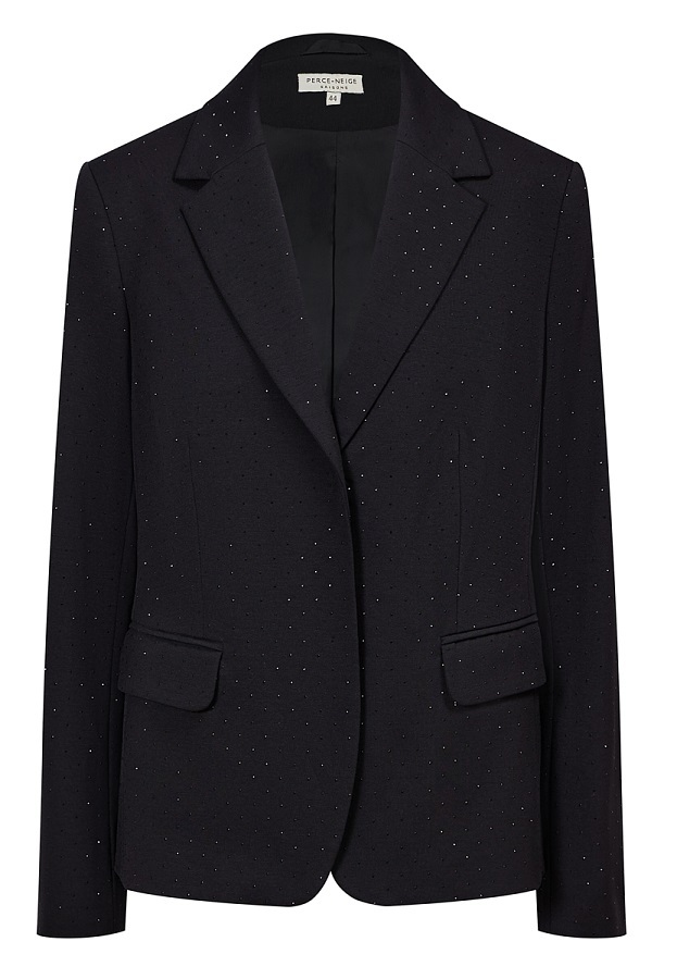 Ткань с хлопком, декорированная множеством мелких стразов. Они создают эффект мерцания и придают жакету по-настоящему праздничный и роскошный вид.