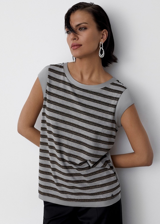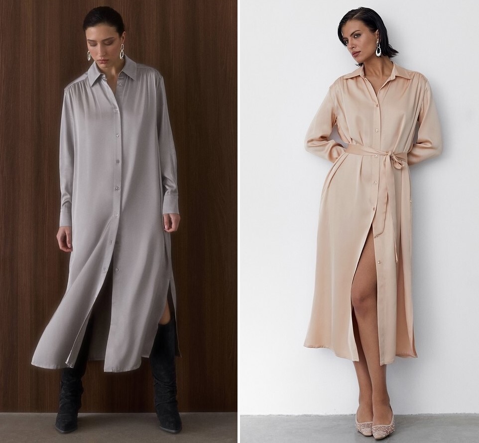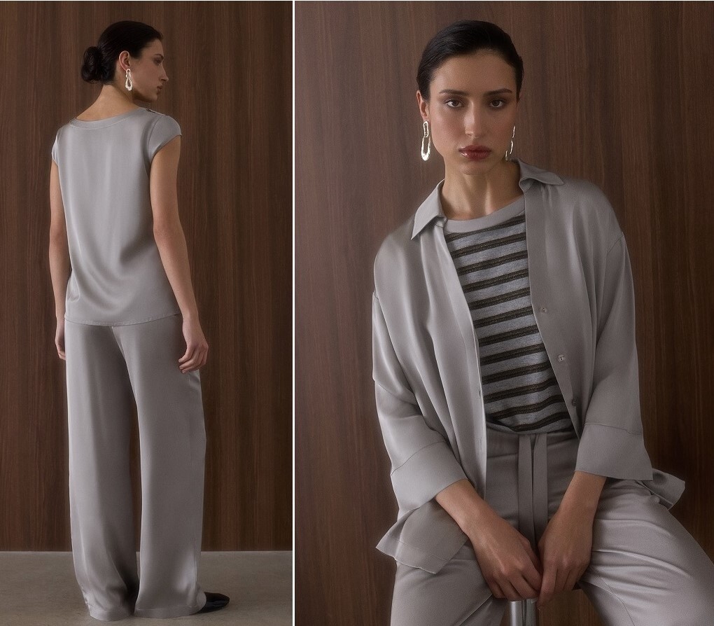 Комбинация блестящего плотного сатина в цвете серебряный металлик и тонкой натуральной вискозы прекрасно стилизуется как для кэжуал образа с базовыми брюками, так и для особого случая!