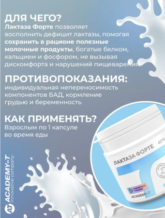 Это продукт для коррекции непереносимости лактозы, который содержит фермент для усвоения молочных продуктов (лактазу). Непереносимость лактозы – проблема, знакомая многим. Если после употребления молочных продуктов вы испытываете тяжесть в животе, вздутие, тошноту и другие неприятные ощущения, возможно, у вас не усваивается лактоза, которая содержится в этих продуктах. Происходит это из-за недостатка в организме фермента лактазы, так как именно он отвечает за расщепление молочного сахара (лактозы). Эта проблема встречается более чем у 20% населения европейской части России, но далеко не все о ней знают, принимая возникающие малоприятные симптомы за временный дискомфорт.