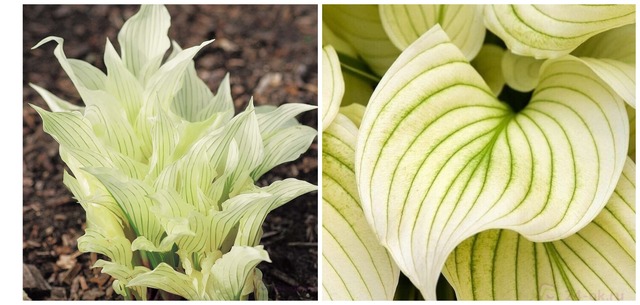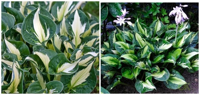 Листья весной сливочно-белые, со временем приобретают зеленоватый оттенок, и тонкие выразительные зеленые полосы. Белый окрас листьев дольше сохраняется при посадке в хорошо освещенном месте. Цветки лавандовые. Ширина куста 60 - 70 см, высота 30 - 40 см.