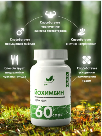 Это алкалоид из коры африканского дерева йохимбе, используемый для повышения либидо, улучшения эрекции и как жиросжигатель, блокируя альфа-2-адренорецепторы, что усиливает кровоток и расщепление жира, а также стимулирует ЦНС, повышая энергию, работоспособность и настроение. Он помогает при сексуальных расстройствах и усталости, но имеет противопоказания (гипертония, болезни почек, печени, психические расстройства)