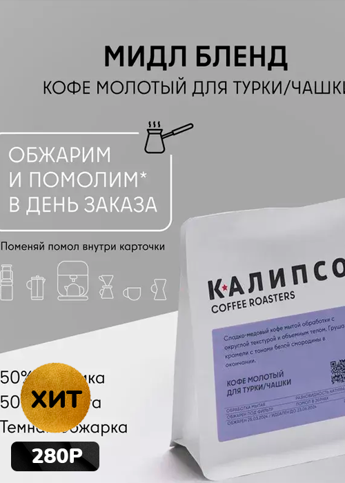 Кофе в зернах МИДЛ БЛЕНД 200 гр /Калипсо Кофе/50% Арабика