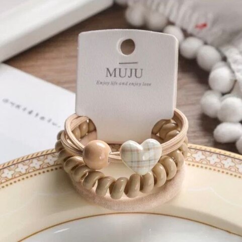 Набор резинок для волос 3 шт. бежевые (Пружинка, Тканевая, СЕРДЦЕ с шариком)