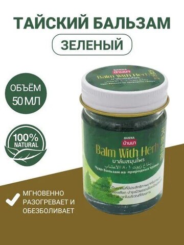 Тайский натуральный зеленый бальзам с травами - согревающее, анальгезирующее, антисептическое средство Banna, 50 гр.