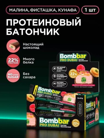 Bombbar Протеиновые батончики в шоколаде без сахара "Малина, фисташка и кунафа", 45г