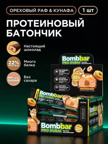 Bombbar Протеиновые батончики в шоколаде без сахара "Ореховый раф и кунафа", 45г
