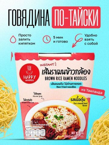 Лапша рамен из коричневого риса быстрого приготовления "Говядина по-тайски" Happy Noodle, стакан 65 г