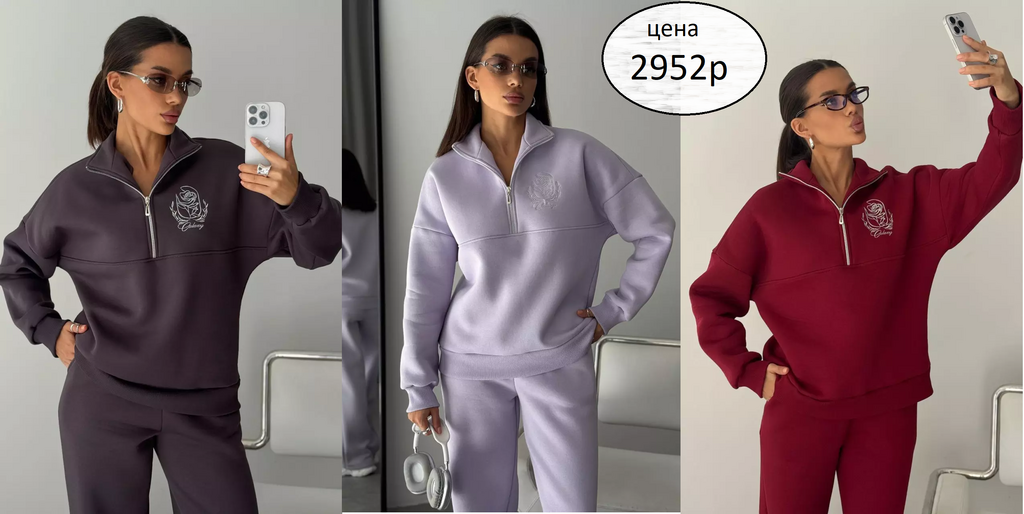 Тёплый женский костюм — свитшот + брюки с высокой талией. Плотный футер (хлопок/полиэстер) — тепло и дышит. Прямой, свободный крой — удобно для повседневной носки.