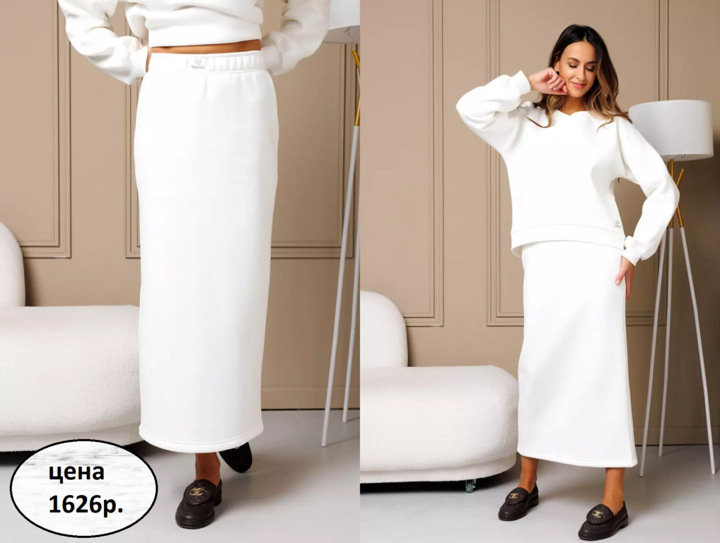 утеплённая макси‑юбка на широкой резинке, с задним разрезом. Ткань: футер 3‑нитка с начёсом (65% хлопок, 35% п/э) — тёплая, не скатывается. Размеры до 52, подходит беременным и plus‑size. Стиль: спорт‑шик/офис/школа.