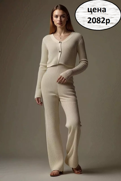 Мягкий вязаный костюм с рифлёной «в полоску» фактурой — тёплый, уютный и объёмный, визуально вытягивает силуэт и сохраняет форму при частом ношении. Универсальный дизайн (кофта на пуговицах с V‑вырезом и джоггеры с высоким поясом) легко сочетает практичность и стиль для города, дома и праздников, подходя для любого роста и служа отличным подарком.