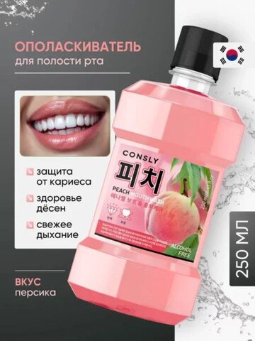 Consly Ополаскиватель для полости рта с ксилитом и вкусом персика, 250 мл.