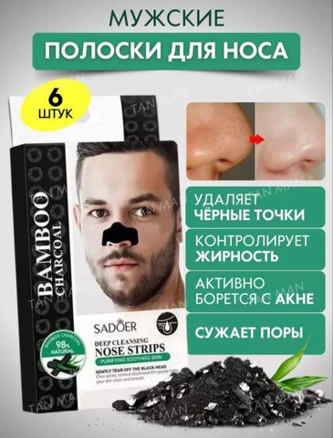 Мужские очищающие полоски для носа от чёрных точек с бамбуковым углем Sadoer, набор 6 штук.