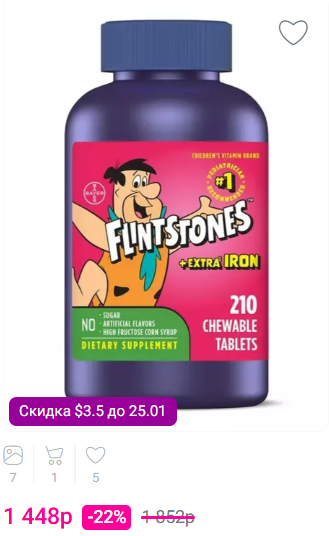 Мультивитамины для детей Flintstones — это проверенный бренд, который пользуется доверием уже более 50 лет, обеспечивая детей необходимыми питательными веществами для роста и развития здоровья. Витамины Flintstones с дополнительным железом для детей содержат 15 незаменимых витаминов и минералов. В их число входят ключевые питательные вещества, которые поддерживают физическую энергию, помогая преобразовывать пищу в топливо, укрепляют здоровье костей, иммунитет и зрение. Они упакованы в легко разжевываемые таблетки с фруктовым вкусом, которые понравятся детям.