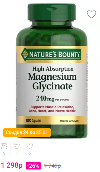 Витаминная добавка Nature's Bounty® High Absorption Magnesium Glycinate — отличный источник магния, обеспечивающий поддержку всего организма. Магний играет важную роль в нормальной работе организма, но, по данным Национального исследования здоровья и питания (NHANES), большинство взрослых не получают достаточного количества этого важного минерала из продуктов питания. Добавление в рацион добавки магния с глицинатом магния высокой усвояемости Nature's Bounty® обеспечивает жизненно важную поддержку здоровья сердца, костей, нервов и мышц. Наша формула с высокой усвояемостью, содержащая 240 мг глицината магния на порцию, также помогает справиться с периодическим стрессом и поддерживает спокойное, расслабленное настроение.