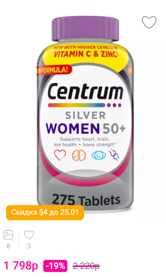 Мультивитаминный комплекс Centrum Silver для женщин старше 50 лет — это тщательно разработанная мультивитаминная/мультиминеральная добавка. Необходимые питательные вещества для крепких костей и здоровья сердца. Этот женский витаминный комплекс обогащен железом и содержит такие необходимые питательные вещества, как витамин D и кальций, необходимые для укрепления костей. Он также содержит витамины группы B, которые, как известно, способствуют здоровью сердца. Кроме того, он содержит витамины A, C и E, необходимые для здоровья глаз. Эти ключевые микронутриенты помогают восполнить дефицит питательных веществ, способствуя общему здоровью и приливу жизненных сил.