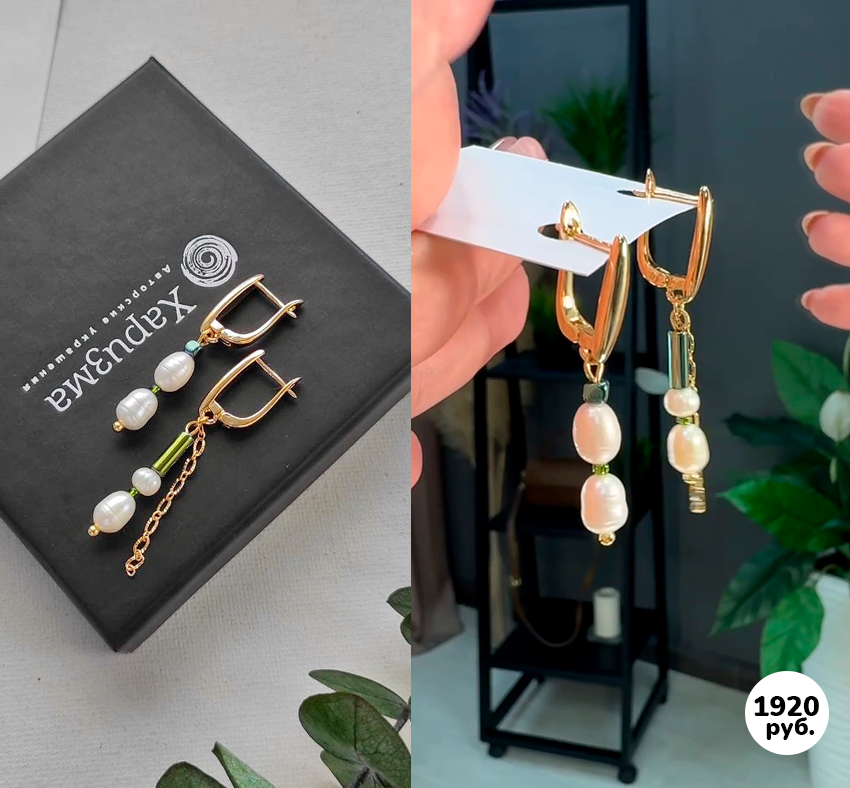 Серьги асимметричные из жемчуга в позолоченой фурнитуре