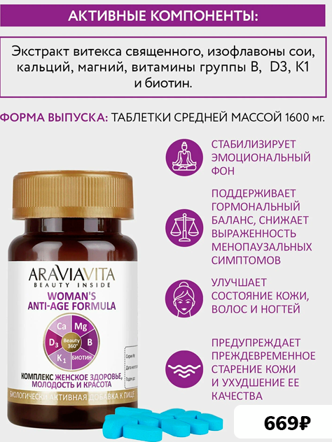 Комплекс изофлавонов сои и экстракт витекса священного-комбинация фитоэстрогенов, витаминов и минералов, необходимых для регулирования проявлений климактерического синдрома, сохранения хорошего самочувствия, тонуса и внешней привлекательности в период менопаузы.
