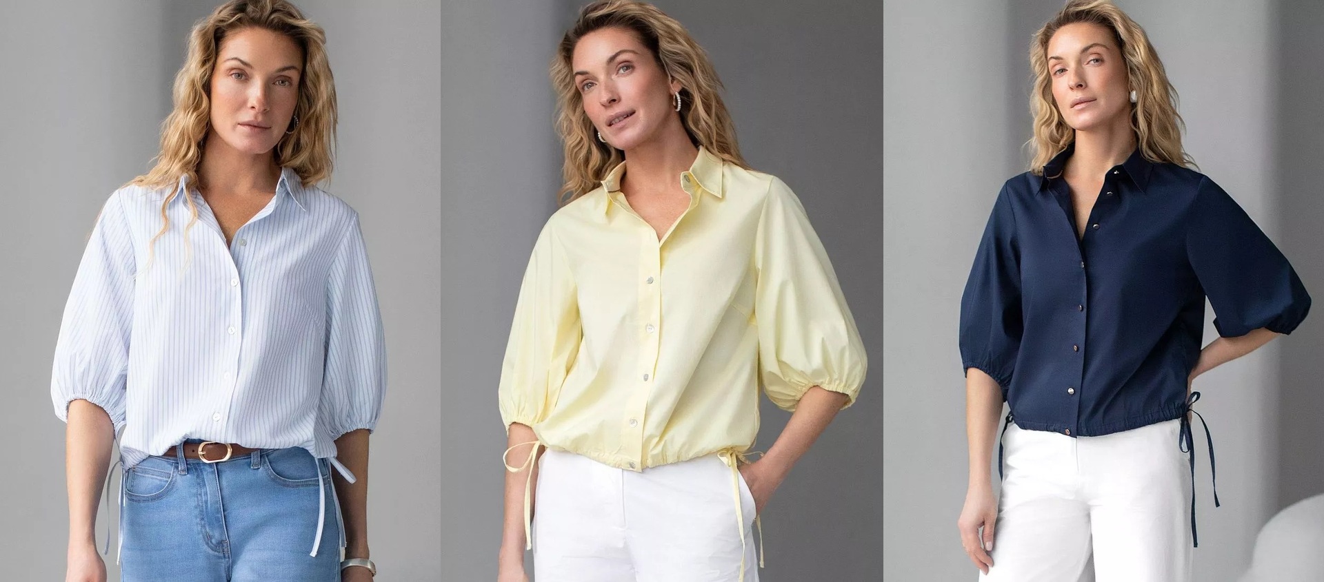 блузки в полоску и укороченные модели с рукавами-буфами.