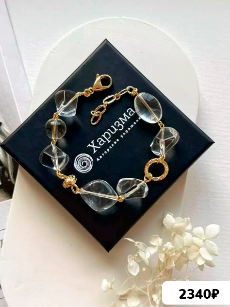 Браслет с горным хрусталем разной формы и позолоченными элементами