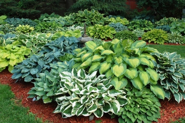 Мульчировать почву под хостами можно органическими материалами и удобрениями (хорошо разложившимся навозом, компостом, раскислённым торфом), а также и скошенной газонной травой, волокнами кокосовой пальмы, щепой, корой, дроблёнными кукурузными початками, скорлупой кедрового ореха, хвойным опадом, сеном, соломой и другими подобными органическими материалами. Во-первых, такой прием помогает держать корни в более прохладных слоях почвы, во-вторых, уменьшается испарение влаги через поверхность почвы, в-третьих, улучшается структура почвы.